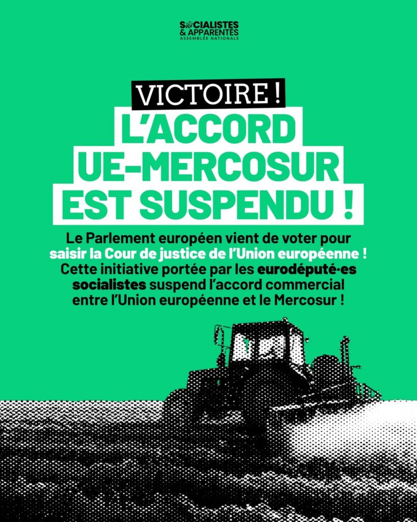 Le 21 janvier, le Parlement européen a voté pour la saisine de la Cour de justice de l’Union européenne (CJUE), suspendant ainsi l’entrée en vigueur de cet accord commercial. Une victoire et un soulagement pour nos agriculteurs et agricultrices !