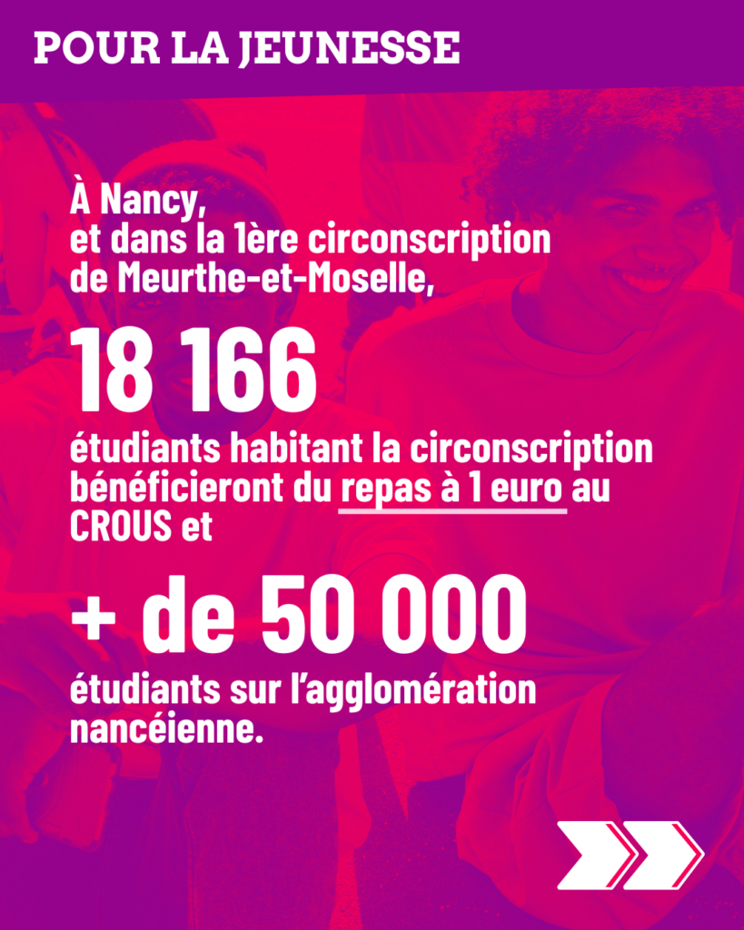 18 166 étudiants habitant la circonscription vont ainsi pouvoir bénéficier du repas à 1 euro au CROUS et + de 50 000 étudiants de l’agglomération nancéienne
